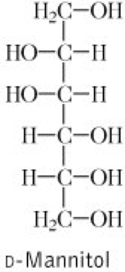 Droge:Manna; Manna (syn. Eschenmanna, Himmelsbrot, Himmelstau, Judenbrot, Stengelmanna, Röhrenmanna), der durch Einschnitte in die Rinde gewonnene, an der Luft getrocknete Saft. Inh.: D-Mannitol (70-90 %) vgl. Formel, D-Glucose (2,2 %), Fructose (2,5 %), Harz, Spuren von Schleim, Fraxin und bitteren Stoffen (in geringwertigen Sorten). Anw.: bei Verstopfungen und Erkrankungen, bei denen eine erleichterte Darmentlehrung mit weichem Stuhl erwünscht ist, z.B. Analfissuren, Hämorrhoiden, nach rektal-analen operativen Eingriffen. Die Droge wird auch als Hilfsstoff in der Galenik und für die Bereitung von Bakteriennährböden eingesetzt.