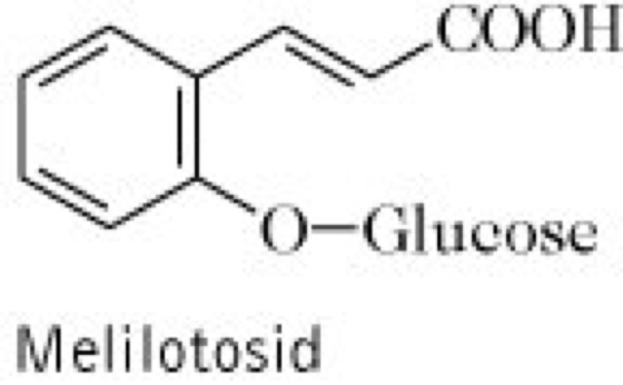 Droge:Galii odorati herba (syn. Asperulae odoratae herba, Herba Asperulae, Herba Cordialis, Herba Hepaticae stellatae, HerbaMatrisilvae, Herba Matrisylviae vel Matrisilvae); Waldmeisterkraut (syn. Maikraut, Waldmeister, Wohlriechendes Meierkraut), die getrockneten oder frischen, während oder kurz vor der Blütezeit im April bis Mai gesammelten oberirdischen Pflanzenteile. Inh.: Cumarin (ca. 1 %, in glykosidischer Bindung, v.a. Melilotosid vgl. Formel, aus welchem beim Welken Cumarin freigesetzt wird und den typischen Geruch entwickelt), Iridoide, v.a. Asperulosid und Monotropein, Gallussäure, Kaffeesäure, p-Cumarsäure, p-Hydroxybenzoesäure und Vanillin. Anw.: in der Volksheilkunde bei Unruhezuständen, Kopf- und Leibschmerzen, Schlaflosigkeit, Herzbeschwerden, Nervenschmerzen und Nervosität sowie bei Lebererkrankungen, Durchblutungsstörungen, Hämorrhoiden und Venenerkrankungen. Im Haushalt wird die frische Droge gern zur Bereitung einer Waldmeisterbowle oder von Maiwein genutzt. Tox.: Cumarin ruft u.a. Kopfschmerzen und bei chronischer Verwendung eventuell Tumore hervor. Daher ist die Verwendung von Cumarin und Waldmeisterkraut zur gewerblichen Herstellung von Essenzen für Genußzwecke seit 1981 verboten. Für die Bereitung der Maibowle sollte pro Liter Wein nicht mehr als 3 g Frischdroge eingesetzt werden.