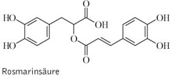 allgemein Substanzen, die die Fähigkeit besitzen, mit Proteinen unlösliche Komplexe zu bilden. Sie sind daher in der Lage, mit den Eiweißen tierischer Häute unlösliche Verbindungen zu bilden, d.h. diese in Leder umzuwandeln. Die pflanzlichen G. besitzen stets adstringierende Eigenschaften, die ebenfalls durch die Reaktion mit den Eiweißen zustande kommen. Die Stärke der Affinität der Proteine zu den Gerbstoffen ist abhängig von der Höhe der Molekulargewichte, der Konformation und der Zusammensetzung des Eiweißes, bes. von der Höhe des Gehaltes an Prolin oder anderen hydrophoben Aminosäuren. G. sind in Samenpflanzen weit verbreitet. Pharmazeutisch genutzte Gerbstoffdrogen liefern bes. die Gattungen Agrimonia, Alchemilla, Hamamelis, Juglans, Krameria, Polygonum, Potentilla, Prunus, Quercus, Rubus, Syzygium und Vaccinium. Im chemischen Aufbau sind G. Polyphenole. Entsprechend der Struktur der G. unterteilt man diese in die Catechingerbstoffe vgl. Formel, in die hydolysierbaren Gerbstoffe, die sog. Gallotannine (Gerbsäure, Tannin) vgl. Formel, Ellagitannine sowie in die Lamiaceengerbstoffe, u.a. Rosmarinsäure vgl. Formel. Wirk.: G. sind Zellgifte. Sie inaktivieren Enzyme und sind Resistenzfaktoren gegen Fäulniserreger. Auf Schleimhäuten verfestigen G. auf Grund ihrer adstringierenden Eigenschaften das kolloidale Gefüge der obersten Gewebsschichten. Kleine Blutkapillaren werden u.a. abgedichtet und eine gegen bakterielle Einwirkung sowie chemische oder mechanische Reize schützende Membran wird gebildet. Sie wirken dadurch entzündungswidrig, reizmildernd und lokalanästhetisch. Sie schränken ferner die Drüsensekretion der Haut und Schleimhaut ein. Anw.: äußerlich bei Entzündungen des Mund- und Rachenraumes, u.a. Stomatitis und Gingivitis, lokalen Blutungen, zur Wundbehandlung, bei Dermatiden, Hautjucken, Hämorrhoiden und Hyperhidrosis. Innerlich zur Einschränkung der Magensaftsekretion bei hyperacider Gastritis sowie als Antidiarrhoika.