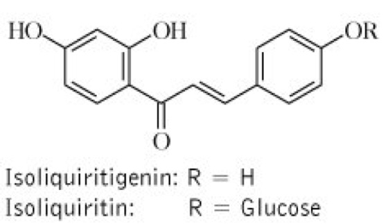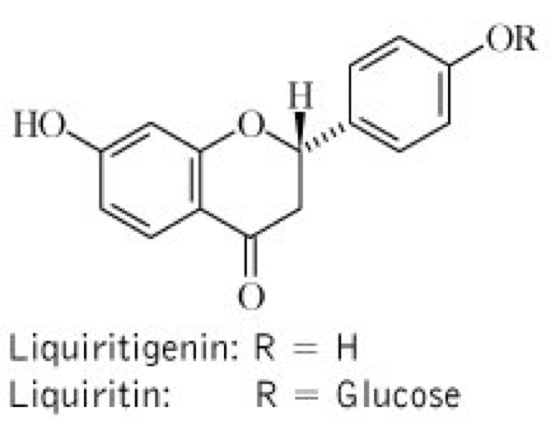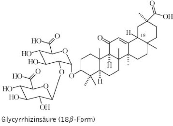 Droge:Liquiritiae radix (syn. Glycyrrhizae radix, Radix Glycyrrhizae, Radix Liquiritiae); Süßholzwurzel (syn. Lakritzenwurzel, Russisches Süßholz, Spanisches Süßholz, Süßholz), die geschälten oder ungeschälten, getrockneten Wurzeln und Ausläufer; vgl. Abbildung. Inh.: Saponine mit Glycyrrhizin, dem Ammonium- bzw. Calciumsalz der Glycyrrhizinsäure (2-18 %) vgl. Formel. Außerdem Flavonoide und Isoflavonoide, u.a. Liquiritigenin und Liquiritin vgl. Formel, Chalkone, bes. Isoliquiritigenin und Isoliquiritin vgl. Formel, sowie Cumarine, u.a Herniarin und Umbelliferon sowie Phytosterole. Wirk.: Zubereitungen der Droge, oft in Form des wäßrigen Extraktes (Succus Liquiritiae) eingesetzt, besitzen expektorierende und antiphlogistische Effekte, sie wirken prophylaktisch gegen Ulkus, jedoch sind bei hoher Dosierung bzw. langer Anwendung mineralcorticoide Effekte zu erwarten, da Glycyrrhizin bzw. das Aglykon Glycyrrhetinsäure in den Corticosteroidmetabolismus eingreifen. Vermutlich erfolgt dabei eine Wechselwirkung mit den Steroidmetabolisierenden Enzymen δ-5-β-Reductase und 11-Hydroxy-Steroidhydrogenase. Als Folge kann ein Pseudo-Hyperaldosteronismus eintreten. Anw.: Katarrhe der oberen Luftwege, bei Gastritis, Magengeschwüren. Bestandteil entsprechender Teemischungen sowie Fertigarzneimittel. Zur Teezubereitung beträgt die mittlere Tagesdosis 5-15 g Droge. Geg.: Cholestatische Lebererkrankungen, Hypertonie, Hypokaliämie, schwere Niereninsuffizienz, Schwangerschaft.