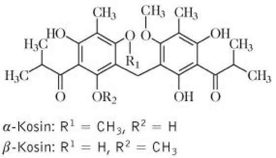 Droge:Koso flos (syn. Brayerae flos, Coussi flos, Cousso flos, Cusso, Flores Brayerae, Flores Hageniae, Flos Koso); Hagenia-abyssinica-Blüten (syn. Kosoblüten, Kussoblüten, Wurmblüten), die nach dem Verblühen gesammelten und getrockneten, rötlichen, weiblichen Blüten. Die Droge ist giftig! Inh.: Phloroglucinole (komplexes Gemisch monomerer bis trimerer, durch Methylbrücken verknüpfter Acylphloroglucinole, Kosotoxin, Protokosin vgl. Formel, Kosine vgl. Formel), Gerbstoffe, Harz, äther. Öl, Gummi. Anw.: früher in Europa als Bandwurmmittel genutzt, das heute obsolet ist. In der Volksheilkunde Afrikas bis heute zu diesem Zweck angewendet. Die Wirksamkeit ist unzureichend belegt. In Äthiopien wird die Droge auch als Insektizid benutzt.