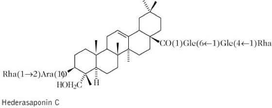 Droge:Hederae helicis folium (syn. Folia Hederae, Folia Hederae arboreae, FoliaHederae communis, Folia Hederae helicis, Folia Hederae maioris, Folia Hederae nigrae, FoliaHelicis, Herba hederae helicis); Efeublätter (syn. Adamsblätter, Ivenblätter, Rampelblätter), die getrockneten Laubblätter. Inh.: Triterpensaponine mit Hederasaponin C bzw. Hederacosid C vgl. Formel als Hauptkomponente. Weitere Bestandteile sind Flavonolglykoside, u.a. Rutin und Kämpferol-3-rutinosid, Polyine, u.a. Falcarinon und Falcarinol, Sterole, u.a. Sitosterol; Scopolin, Kaffeesäurederivate und geringe Mengen an äther. Öl. Anw.: in Form von Arzneifertigpräparaten bei Erkrankungen der Atmungsorgane, bes. als Sekretolytikum und Antispasmodikum, bei spastischer Bronchitis und chronischen Katarrhen. Efeuextrakte finden auch in einigen Kosmetika, z.B. Shampoos, Anwendung.