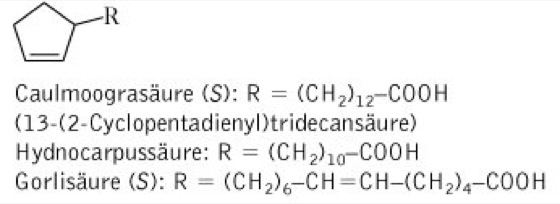 Droge:Chaulmoograe oleum (syn., Oleum Chaulmoograe); Chaulmoograöl (syn. Gynocardiaöl, Chaulmoogra Oil), das durch Kaltpressung aus den frischen, reifen Samen gewonnene Öl. Die Droge ist giftig! Inh.: Triglyceride (zu 70-80 % Glyceride von Cyclopentenylfettsäuren: Hydnocarpussäure, Chaulmoograsäure, Gorlisäure vgl. Formel sowie Palmitin-, Stearin- und Ölsäure). Anw.: in der Volksheilkunde innerlich bei Lepra und äußerlich bei chronischen Hauterkrankungen.
