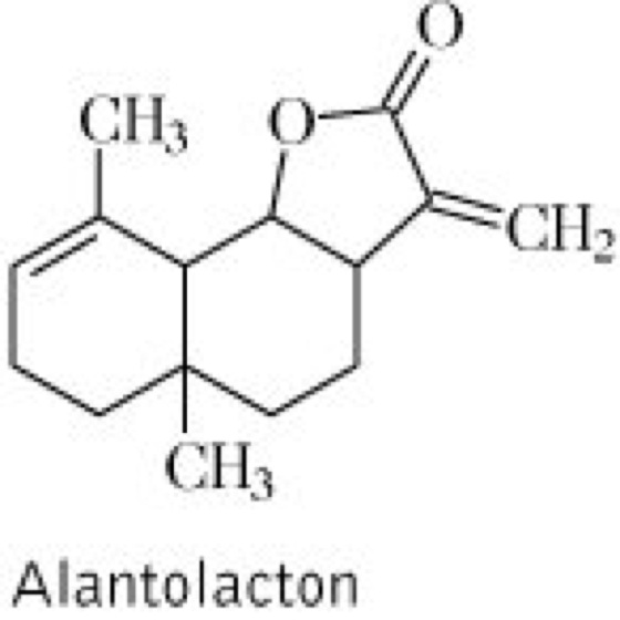 Drogen:1.Helenii rhizoma (syn. Helenii radix, Radix Enulae, RadixHelenii, Radix Inulae, Rhizoma Helenii); Alantwurzel (syn. Alethwurzel, Altwurzel, Brustalant, Darmwurz, Donavarwurz, Edelherzwurzel, Fadenwurzel, Glockenwurzel, Großer Heinrich, Handwurzel, Helenenkrautwurzel, Odinskopfwurzel, Oldwurzel, Schlangenwurz, Unlenkwurzel). Inh.: Die Droge enthält 1 bis 3 % äther. Öl, bes. Sesquiterpenlactone, u.a. Alantolacton vgl. Formel, Isoalantolacton und Dihydroalantolacton, bis zu 44 % Inulin, daneben Harze, Wachse und Pektine. Anw.: In der Volksheilkunde wird die Droge als Tee bzw. ein Extrakt als Expektorans, Tonikum, Stomachikum sowie gegen Wurmbefall eingesetzt. Darüber hinaus findet die Droge Anwendung bei Menstruationsbeschwerden, Infektionen der ableitenden Harnwege, Herzbeschwerden, Erkältungen und bei Kopfschmerz. Aufgrund des Gehaltes an Sesquiterpenlactonen besitzt die Alantwurzel ein hohes Allergisierungspotential, das zu Kontaktallergien führen kann. Ihre Verwendung wird daher nicht empfohlen. 2.Oleum Helenii; Alantöl, das äther. Öl. Inh.:S. Heleniirhizoma. Anw.: früher als Antiseptikum bei Infektionen der Blase und Harnröhre, bei chronischen Diarrhoen und Bronchitiden, mitunter auch als Wurmmittel. Infolge hohem Allergisierungspotential heute obsolet.