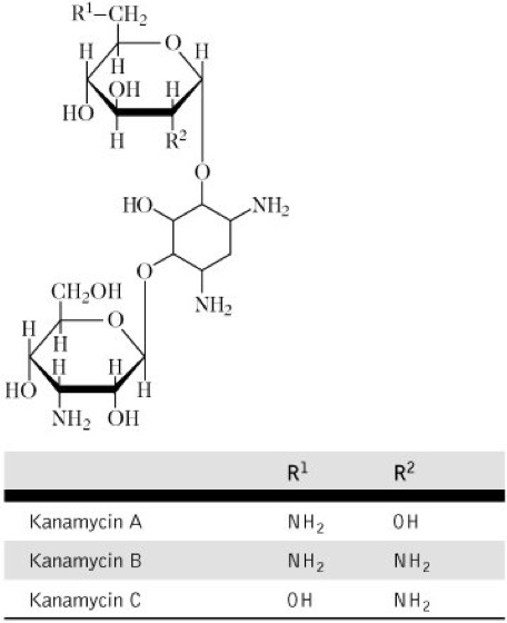 trimeres Aminoglykosidantibiotikum, das aus 2-Desoxystreptamin, 6-d-Glucosamin und Kanosamin aufgebaut ist. Gebildet wird das Antibiotikum von Streptomyces kanamyceticus und Streptomyces takakuarensis. Anw.: Eingesetzt werden Kanamycinmonosulfat oder Kanamycinhydrogensulfat vor allem bei lokalen Infektionen am Auge und seltener bei Darminfektionen. Früher als Tuberkulostatikum verwendet, wird es heute wegen zu starker Nebenwirkungen (Ototoxizität) nicht mehr systemisch appliziert.