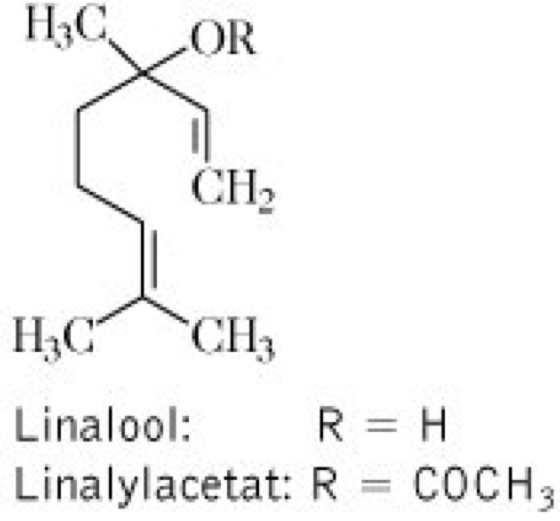 Drogen:1.Lavandulae aetheroleum (syn. Aetheroleum Lavandulae, Lavandulae oleum, Oleum Lavandulae); Lavendelöl (syn. Spiköl), das durch Wasserdampfdestillation aus den frischen Blüten oder Blütenständen gewonnene äther. Öl. Inh.: (-)-Linalool (20-50 %) und (-)-Linalylacetat (30-40 %) als Hauptkomponenten vgl. Formel, wobei der Ester die wertbestimmende Komponente darstellt. Weitere Bestandteile sind u.a. cis-Ocimen (3-7 %), Terpinen-4-ol (3-5 %), β-Caryophyllen 1,8-Cineol (1-2 %), Limonen, Geraniol, Geranylacetat, α-Pinen und Camphen (0,1-0,5 %). Anw.: in Präparaten bei Einschlafstörungen, funktionellen Oberbauchbeschwerden und äußerlich in der Balneotherapie, u.a. als Hautreizmittel, bei funktionellen Kreislaufbeschwerden sowie in Einreibungen bei rheumatischen Leiden. 2.Lavandulae flos (syn. Flores Lavandulae, FlosLavandulae, Flores Spicae); Lavendelblüten (syn. Blafendel, Lavander), die kurz vor der völligen Entfaltung gesammelten und getrockneten Blüten. Inh.: äther. Öl (1-3 %, s. Lavandulae aetheroleum). Anw.: Unruhezustände, u.a. nervöser Reizmagen, nervöse Darmbeschwerden, Einschlafstörungen, in der Balneotherapie besonders zur Behandlung funktioneller Kreislaufstörungen.