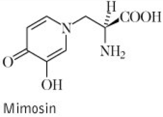 Droge:Folia Leucaenae; Wilde Tamarindenblätter, die Laubblätter. Inh.: bes. die nichtproteinogene Aminosäure Mimosin (2-5 %) vgl. Formel. Wirk.: Mimosin verursacht Haarausfall bei Schaf, Pferd und Schwein; es stört den Estrogenzyklus und die DNA-Synthese von wachsenden Haaren. Anw.: als Enthaaarungsmittel bei Schafen.