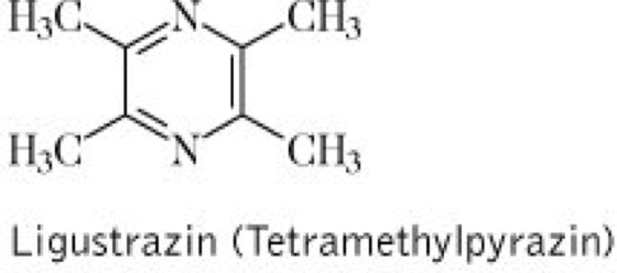 Ligusticum chuanxiong Fam.: Apiaceae (Umbelliferae). Vork.: China. Droge: die ganze Pflanze. Inh.: Ligustrazin (Tetramethylpyrazin) vgl. Formel. Wirk.: antithrombotisch durch Hemmung der Plättchenaggregation. Anw.: in der chinesischen Volksheilkunde bei Gefäßleiden.