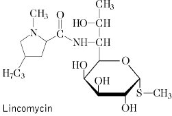 Derivat des 1-Methyl-4-propyl-L-prolins, das amidartig mit einer Thiooctapyranose (Methyl-α-thiolincosamin) verknüpft ist und vor allem gegen grampositive Erreger und Anaerobier bakteriostatisch wirkt. Es hemmt die Proteinbiosynthese in ähnlicher Weise wie Chloramphenicol. Dieses Antibiotikum wird von Streptomyces lincolnensis gebildet. Anw.: therapieresistente Infektionen durch Staphylokokken, besonders akute und chronische Osteomyelitiden. Die auftretenden Nebenwirkungen (Allergien, Leber- und Nierenfunktionsstörungen) schränken den Gebrauch stark ein.