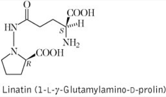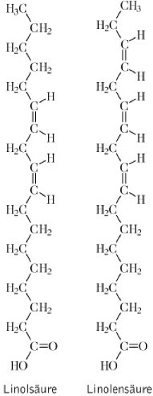 Drogen:1.Lini semen (syn. Semen Lini); Leinsamen (syn. Flachssamen, Flachslinsen, Haarlinsen, Leinwanzen, Hornsamen), vgl. Abbildung. Inh.: Schleime (3-10 %, besonders in der Samenschale), Ballaststoffe (25 %), fettes Öl (30-40 %), Proteine (ca. 25 %), Aminosäuren, wie Linatin vgl. Formel; daneben Sterole und Triterpene sowie bis zu 1,5 % cyanogene Glykoside (Linustatin, Neolinustatin). Anw.: Leinsamen sind ganz, leicht gequetscht oder geschrotet ein mild wirkendes Laxans, induziert durch die Quellung der Samenschalen im Darm (Volumenreiz). Aufgrund der Schleimstoffe dient die Droge auch als einhüllendes Mittel (Mucilaginosum). 2.Oleum Lini (syn. Lini oleum); Leinöl. Inh.: Das aus den Samen kaltgepreßte, fette, trocknende Öl ist eine goldgelbe Flüssigkeit mit einem hohen Anteil an ungesättigten (essentiellen) Fettsäuren (Linolsäure, Linolensäure vgl. Formel und Ölsäure) sowie Palmitin- und Stearinsäure. Anw.: Leinöl hat schwach laxierende Eigenschaften. Die bei der Ölgewinnung anfallenden Preßrückstände (Placenta Seminis Lini) werden äußerlich zu Kataplasmen verwendet, da sie ein großes Wärmespeichervermögen aufweisen. Offizinell war früher in der Dermatologie ein Brandliniment (Linimentum Calcariae), das aus Leinöl und Kalkwasser bereitet wurde. Leinöl besitzt Bedeutung als Diätetikum sowie als Ausgangsstoff für die Herstellung von Lacken, Firnissen und Seifen. 3.Filum lini sterile; Steriler Leinenfaden, aus des Fasern des Pericycels gesponnener Faden. Anw.: in der Chirurgie als Nahtmaterial.