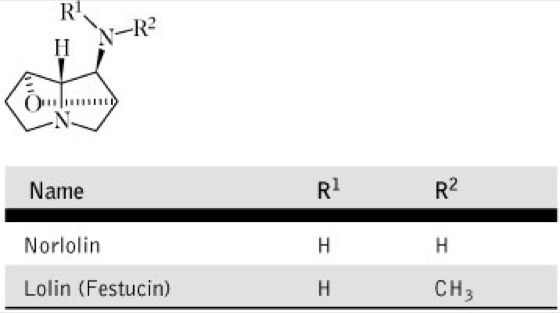 Droge:Semen Lolii temulenti (syn. FructusLolii); Taumellolchsamen (syn. Taumellolchfrüchte), der reife Samen. Die Droge ist giftig! Inh.: Temulin (ca. 0,06 %), Perlolin, Norlolin und Lolin vgl. Formel (Pyrrolizidin-Alkaloide), fettes Öl, freie Fettsäuren, Fructosane, Gerbstoffe. Anw.: früher in der Volksheilkunde bei Rheuma und Gicht, bei verzögerter Menstruation, Blutvergiftung, Flechten und Geschwüren.
