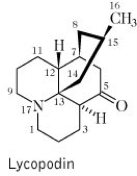 Drogen:1.Lycopodii herba (syn. Herba Lycopodii, Herba Musci clavati, Herba Musci terrestris); Bärlappkraut (syn. Erdmoos, Gürtelkraut, Hexenkraut, Moosfarn, Schlangenkraut, Schlangenmoos), das getrocknete, im Mai und Juni gesammelte Kraut. Die Droge ist giftig! Inh.: Alkaloide (0,1-0,4 %, v.a. Lycopodin vgl. Formel, Fawcettin und ihre Derivate), Triterpene (α-Onocerin, Lycoclavatol und weitere Bisnoronoceran-Derivate), Fett, Sterole, Phenolcarbonsäuren, Azelainsäure, Flavonoide. Anw.: in der Volksheilkunde innerlich zur Diuresesteigerung bei Nieren- und Blasenleiden, Koliken, Erkrankungen der Harn- und Geschlechtsorgane, Menstruationsbeschwerden und Rheuma. In Indien auch gegen Impotenz. Äußerlich wurde die Droge bei Hautleiden und Ekzemen eingesetzt. Die Wirksamkeit ist nicht belegt. Wegen der toxischen Begleiterscheinungen wird vom Gebrauch der Droge abgeraten. 2.Lycopodium (syn. Farina Lycopodii, Pulvis Lycopodii, Semen Lycopodii, Sporae Lycopodii, Sulfurvegetabile), die reifen Sporen der Gattung Lycopodium. Inh.: nur Spuren von Alkaloiden, fettes Öl (40-50 %, v.a. Triglyceride ungesättigter Fettsäuren), Dihydrokaffeesäureester (ca. 3 %), Polyterpene (23-48 % Sporonin), Mineralien (v.a. Aluminiumsalze). Anw.: in der Volksheilkunde innerlich bei Nieren- und Blasenleiden, Koliken, Durchfällen und Rheumatismus sowie äußerlich als Wundstreupuder bei juckender Haut und nässenden Ekzemen. In der Galenik spielte die Droge eine große Rolle bei der Herstellung von Pillen, heute wird sie noch eingesetzt als Conspergens für Präservative und OP-Handschuhe sowie als Zusatz für Emulsionen. In der Kosmetik wird die Droge für Trockenshampoos und Gesichtspuder verwendet. In der Technik dient sie als Zusatz zu Feuerwerkskörpern bzw. in der Kriminalistik zusammen mit Carmin zum Sichtbarmachen von Fingerabdrücken. vgl. Abbildung