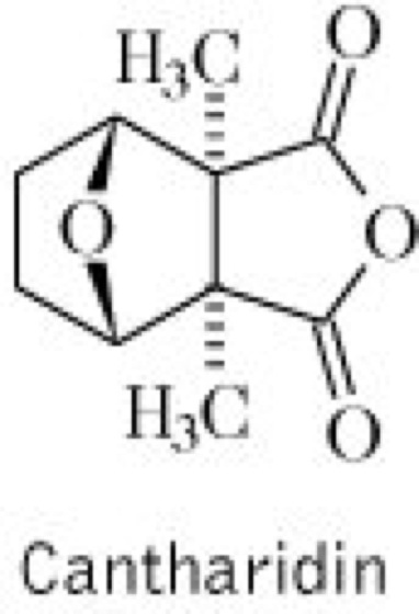 Droge:Cantharides (syn. Cantharis, Cantharis hispanica, Muscae hispanicae); Spanische Fliegen (syn. Blasenkäfer, Grüne Kanthariden, Kanthariden, Pflasterkäfer), die getrockneten Käfer. Die Droge ist stark toxisch! Inh.: Cantharidin (0,6-0,9 %), ein Monoterpen vgl. Formel, Fette, flüchtiges Öl, Farbstoffe, Harz. Anw.: zur Hautreiztherapie (Vesicans) in Form von Salben und Pflastern bei rheumatischen und neuralgischen Beschwerden. Die früher praktizierte Anwendung als Aphrodisiakum ist wegen der Gefahr tödlicher Vergiftungen und unsicherer Wirksamkeit abzulehnen.