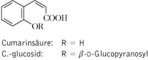 Droge:Meliloti herba (syn. Herba Meliloti, Herba Meliloticitrini, Summitates Meliloti); Melilotus-officinalis-Kraut (syn. Melotenkraut, Malottenkraut, Steinklee), die getrockneten oder frischen Blätter und blühenden Zweige. Inh.: Hydroxyzimtsäurederivate, bes. o-Cumarinsäureglykosid (Melilotosid, ca. 6 % der Trockenmasse) vgl. Formel, Cumarin (ca. 0,9 %), Triterpensaponine und Flavonoide. Wirk.: Drogenzubereitungen besitzen antiödematöse Eigenschaften bei entzündlichem und Stauungsödem. Es ist eine Verbesserung der Blut- und Lymphströmung, eine Steigerung der Kapillarresistenz und eine Senkung der Gefäßpermeabilität möglich. Anw.: in Extrakten Bestandteil von Phytopharmaka, die als Venenmittel, zur unterstützenden Behandlung der Thrombophlebitis, des postthrombotischen Syndroms, von Hämorrhoiden und Lymphstauungen eingesetzt werden. Auch M. alba Medik. und M. altissima Thuill. besitzen das gleiche Spektrum an Wirkstoffen wie M. officinalis und dienen als Ausgangsmaterial für die Droge.