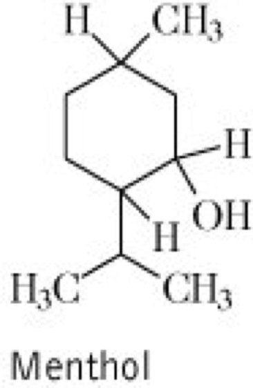 (Mentholum, Levomentholum, Pfefferminzkampfer), Monoterpen aus Mentha-Arten. Wirk.: M. bewirkt durch Wechselwirkung mit den temperaturempfindlichen Nervenendigungen auf der Haut ein Kältegefühl. Es wirkt außerdem als Cholagogum, Choleretikum und als Hustenmittel. Anw.: Äußerlich wird es als Analgetikum (Migränestift) und Juckreiz-stillendes Mittel eingesetzt. Geg.: nicht bei Säuglingen und Kleinkindern anwenden, da sonst Kehlkopfkrämpfe und Atemnot ausgelöst werden können.