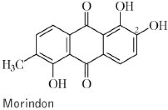 Droge:Morindawurzel. Inh.: glykosidierte Anthrachinone, wie Nordamnacanthal (ca. 1,7 %), Morindon (ca. 0,5 %) vgl. Formel; Flavonoide, Iridoide; in den Früchten auch Vitamine und Carotinoide. Anw.: in der Volksheilkunde als Laxans und gegen hohen Blutdruck sowie gegen Eingeweidewürmer; die Früchte werden darüber hinaus bei Diabetes, Leber- und Milzerkrankungen sowie bei Nierenleiden eingesetzt; der Fruchtsaft dient zur Behandlung von Halsschmerzen; die Blätter kommen bei Fieber, zur Wundbehandlung, als Adstringens und bei gynäkologischen Leiden zum Einsaz. Der rote Farbstoff der Wurzelrinde wird technisch in der Färberei verwendet.