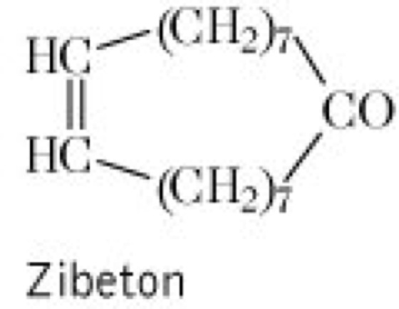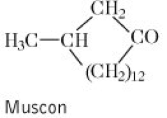 Droge:Moschus tibetanus (syn. Moschus tonquinensis, Moschus orientalis); Moschus, das eingetrocknete Sekret des Moschusbockes. Inh.: 1-2 % äther. Öl mit Muscon vgl. Formel und Zibeton vgl. Formel (Ketone), Alkaloide (Muscopyridin), Steroide (Androstanderivate, Cholesterol), aliphatische Sulfate (Musclide), Fett, Harze, Proteine, Mineralien. Anw.: früher als Stimulans und Analeptikum bei Kollapszuständen, Herzschwäche und Ohnmachten (Tinctura Moschi). In der Kosmetik und Parfümerie als Fixateur.