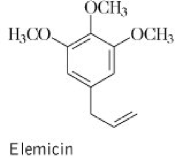 Drogen:1.Myristicae aetheroleum (syn. Aetheroleum Myristicae, Macidis aetheroleum, Myristicaeessentia, Oleum Macidis, Oleum Myristicae, Oleum Myristicae aethereum, Oleum Nucismoschati, Oleum Nucis moschati aethereum); Muskatöl (syn. Ätherisches Muskatnußöl, Ätherisches Muskatöl, Macisöl), das äther. Öl des Samens oder des Samenmantels. Inh.: Monoterpene (ca. 87,5 %) mit Sabinen als Hauptkomponente (39 %) sowie α-Pinen, β-Pinen, α-Phellandren, Limonen, 1,8-Cineol und Terpinen-4-ol. Anw.: volkstümlich innerlich bei Verdauungsstörungen, Blähungen und als Stimulans; äußerlich bei Katarrhen der Atemwege sowie bei rheumatischen Beschwerden. Industriell zur Herstellung von Mund- und Zahnpflegemitteln sowie in der Parfümerie. 2.Myristicae arillus (syn. Arillus Myristicae, Flores Macidis); Macis (syn. Banda-Macis, Muskatblüte), der zusammengedrückte, getrocknete Samenmantel. Inh.: äther. Öl (4-15 %) mit 7-18 % aromatischen Ethern, darunter Myristicin als dominierende Komponente, ferner u.a. Diphenylpropanoide. Anw.: volkstümlich bei Verdauungsstörungen sowie im Haushalt als Gewürz. 3.Myristicae oleum expressum (syn. Adeps Nusticae, Balsamum Nusticae, Oleum Myristicae, Oleum Myristicae expressum, Oleum Nucis moschatae, Oleum Nucistae, Oleum Nusticae); Muskatbutter (syn. Muskatbalsam, Muskatnußbutter, Muskatnußöl), das aus den Samen durch Auspressen gewonnene rotbraune, stellenweise hellere Gemenge von Fett, äther. Öl und Farbstoffen. Inh.: Fett (30-40 %) mit Laurin-, Tridecan-, Myristin-, Pentadecan, Palmitin-, Heptadecan-, Stearin- und Ölsäure, äther. Öl (4-12 %), Farbstoffe. Anw.: volkstümlich innerlich bei Verdauungsbeschwerden, äußerlich bei Hautleiden und als Einreibung bei rheumatischen Erkrankungen. 4.Myristicae semen (syn. Myristicaenux, Nuces Aromaticae, Nuces Nucistae, Nuclei Myristicae, Nucleus Mucistae, Nux Moschata, NuxMyristicae, Semen Myristicae, Semen Nucistae); Muskatnuß (syn. Muskatsamen), die getrockneten, vom Samenmantel und der Samenschale befreiten Samenkerne; vgl. Abbildung. Inh.: äther. Öl (7-16 %) mit ca. 80 % Monoterpenkohlenwasserstoffen, v.a. (+)-α-Pinen und (+) β-Pinen, Terpenalkoholen, u.a. Geraniol, Borneol, Linalool und Terpineol sowie Phenylpropanderivaten (ca. 10 %) mit Myristicin als Hauptkomponente und geringen Mengen Safrol, Elemicin vgl. Formel und Eugenol. Außerdem sind weitere Phenylpropanderivate, Sterole und Saponine enthalten. Anw.: volkstümlich bei Beschwerden im Bereich des Magen-Darm-Traktes, einschließlich flatulenter nervöser Dyspepsie, mißbräuchlich als Abortivum; äußerlich bei rheumatischen Beschwerden. Im Haushalt als Gewürz. Geg.: in höheren Dosen bewirkt die Droge psychische Störungen, verbunden mit halluzinogenen Effekten (Halluzinogene biogenen Ursprungs).