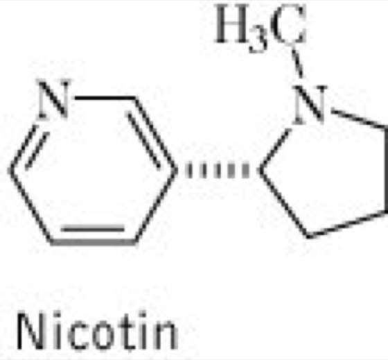 (Nikotin), Pyridinalkaloid aus den Blättern von Nicotiana tabacum. Wirk.: in niedrigen Dosen ähnlich wie Acetylcholin durch Depolarisation der postsynaptischen Membranen ganglienerregend, in höheren Dosen durch Dauerdepolarisierung ganglienblockierend. Diese Eigenschaften bedingen in geringer Dosierung eine Blutdrucksteigerung, verstärkte Magensaftsekretion sowie eine Tonuserhöhung im Magen-Darm-Trakt (Wirkungen beim Rauchen). Bei hoher Dosierung im toxischen Bereich kommt es dagegen zum langanhaltenden Blutdruckabfall und Darmatonie. Im Zentralnervensystem ruft N. in mittlerer Dosierung Tremor sowie Atemstimulation hervor, in toxischen Dosen werden Krämpfe und Atemlähmung ausgelöst. Die Toxizität der Verbindung ist als sehr hoch einzuschätzen, die letale Dosis liegt bei etwa 1 mg/kg Körpergewicht. Diese Menge wird bei oraler Aufnahme von etwa 4-6 Zigaretten oder einer Zigarre erreicht. Beim Rauchen wird nur ein geringer Teil des N. aufgenommen. N. besitzt ein geringes, aber nachweisbares Suchtpotential. Anw.: in Form von Kaugummis und Pflastern wird N. unterstützend zur Raucherentwöhnung eingesetzt, auch in der Schädlingsbekämpfung wird die Verbindung genutzt.