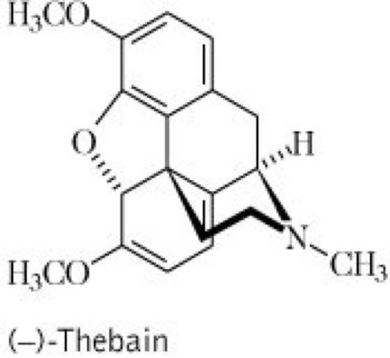 Inh.: Alkaloide mit Thebain vgl. Formel als Hauptalkaloid, das in bestimmten Kultursorten, besonders in der Wurzel, bis zu 98 % des Gesamtalkaloidanteils betragen kann. Es dient zur Partialsynthese von Codein. Der eingetrocknete Milchsaft der Pflanze wird in Analogie zum Opium, obwohl frei von Morphin, als Bractium bezeichnet.