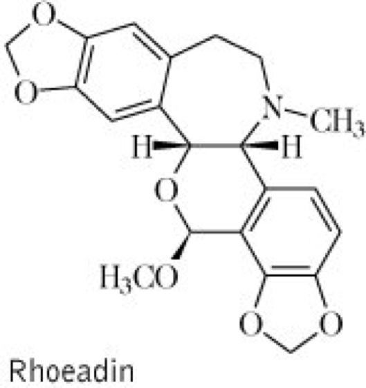 Droge:Rhoeados flos (syn. Flores Papaveris, Flores Papaveris rhoeados, Flores Papaveris erratici, Flores Papaveris rubri, Flores Papaveris silvestris, Flores rhoeados, Flos rhoeados, Papaver rhoeados flos, Petala rhoeados, Rhoeados petalum); Klatschmohnblüten (syn. Klatschrosenblüten), die zur vollen Blüte gesammelten, getrockneten Kronblätter. Inh.: Alkaloide (0,11-0,12 %) mit Rhoeadin vgl. Formel als Hauptalkaloid, ferner Schleimstoffe. Anw.: volkstümlich bei Schmerzen, Unruhe, Schlafstörungen und Beschwerden im Bereich der Atemwege.