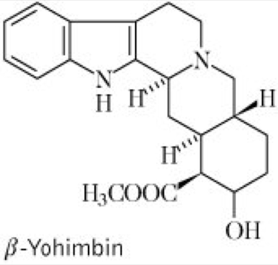 Droge:Yohimbe cortex (syn. Cortex Yohimbe, Cortex Yohimbehe); Yohimberinde (syn. Potenzrinde, Yohimbeherinde), die getrocknete Stamm- und Zweigrinde. Inh.: Alkaloide, besonders Yohimbin (0,8 %), ferner u.a. β-Yohimbin vgl. Formel, Pseudoyohimbin und Raubasin. Anw.: als Sexualtonikum, Bestandteil von entsprechenden Kombinationspäparaten bzw. das Reinalkaloid als Yohimbin-Spiegel, mitunter auch bei Harninkontinenz.