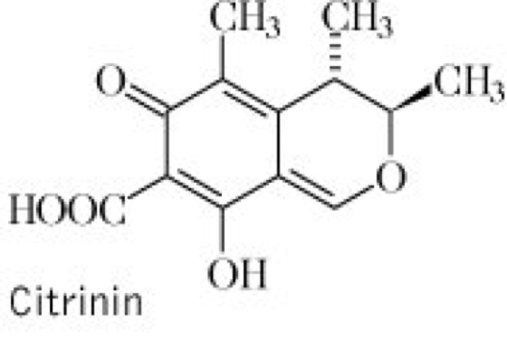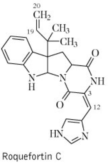 Droge: Pilzkulturen. Inh.: Mykotoxine, u.a. Citrinin vgl. Formel, Roquefortin C vgl. Formel, Festuclavin, PR-Toxin, Enzyme. Anw.: zur Käseherstellung.