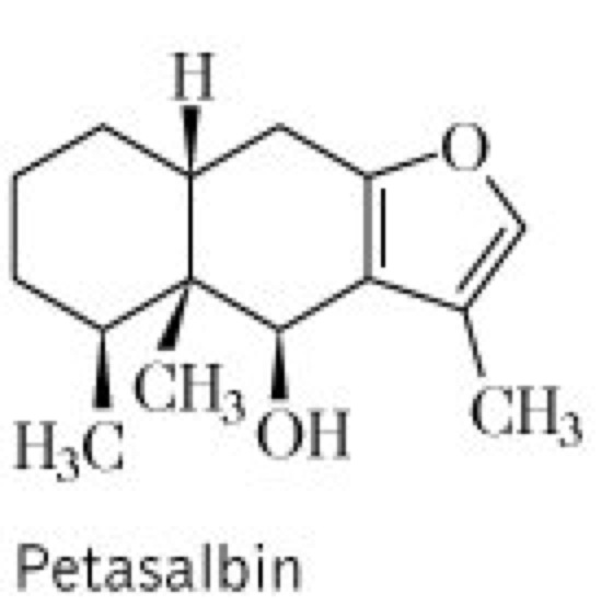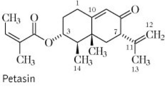 Drogen:1.Petasitidis folium (syn. Folia Petasites, Folia Petasitidis); Pestwurzblätter, die getrockneten oder frischen Blätter. Inh.: Flavonoide, u.a. Astragalin und Isoquercitrin, Sesquiterpene sowie in Spuren Pyrrolizidinalkaloide. Anw.: ausschließlich volkstümlich besonders bei Krampfzuständen im Magen-Darm-Bereich, Erkrankungen der Atmungsorgane, Galle- und Leberbeschwerden sowie äußerlich als Wundheilmittel. 2.Petasitidis rhizoma (syn. Radix Petasites, Radix Petasitidis, Rhizoma Petasitidis); Pestwurzwurzelstock (syn. Kraftwurz), die getrockneten, im Herbst geernteten unterirdischen Teile. Inh.: äther. Öl (0,1-0,4 %) u.a. 1-Nonen, Eremophilen und Furanoeremophilen, ferner Sesquiterpenester, die Derivate des Petasols, Iso- und Neopetasols darstellen, u.a. Petasin vgl. Formel, Petasalbin vgl. Formel, Iso- und Neopetasin sowie Pyrrolizidinalkaloide, besonders Senecionin und Integerrimin als Retronecinester. Anw.: in Zubereitungen in Form von lipophilen oder ethanolischen Extrakten (Tagesdosis 4,5-7 g Droge) zur unterstützenden Behandlung akuter krampfartiger Schmerzen besonders im Bereich der ableitenden Harnorgane sowie bei Spannungskopfschmerzen und Migräne. Volkstümlich auch bei psychovegetativen Funktionsstörungen im Magen-Darm-Bereich sowie bei Erkrankungen der Atmungsorgane, besonders Keuchhusten. Geg.: Aufgrund hepatoxischer, mutagener, teratogener und cancerogener Eigenschaften von Pyrrolizidinalkaloiden mit 1,2-ungesättigtem Necin-Gerüst bestehen Anwendungsbeschränkungen.