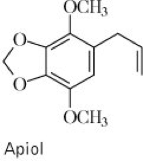 Drogen:1.Petroselini aetheroleum e fructibus (syn. Oleum Petroselini); Petersilienfruchtöl (syn. Petersilienöl), das äther. Öl aus den Früchten. Inh.: Phenylpropane, besonders Apiol vgl. Formel (58-80 %, je nach chemischer Rasse), Myristicin und geringe Mengen Elemicin sowie Terpene, u.a. α- und β-Pinen, β-Phellandren, Terpinolen, Myrcen und Limonen. Anw.: volkstümlich früher zur Entwässerung bei Ödemen und mißbräuchlich als Abortivum. 2.Petroselini fructus (syn. Fructus Petroselini, Semen Petroselini); Petersilienfrüchte (syn. Peterleinsamen, Petersiliensamen, Petroselinum-crispum-Früchte), die meist in ihre Teilfrüchte zerfallenen, trockenen, reifen Spaltfrüchte. Inh.: äther. Öl (2-6 %), s. Petersilienfruchtöl, ferner Furanocumarine, u.a. Bergapten, Isopimpinellin und Psoralen sowie fettes Öl (ca. 20 %) mit Petroselinsäure (60-80 %) als dominierender Fettsäurekomponente. Anw.: volkstümlich bei Verdauungs- und Nierenbeschwerden Geg.: Allergie gegen Petersilie oder Apiol sowie bei bestehenden Nierenentzündungen. 3.Petroselini herba (syn. Folia Petroselini, Herba Petroselini); Petersilienkraut, die frischen oder getrockneten oberirdischen Teile. Inh.: äther. Öl (0,016-0,3 %, Frischdroge), s. Petersilienfruchtöl, ferner Furanocumarine, Vitamine, z.B. Vitamin C (165 mg/100 g Frischdroge) sowie Carotinoide und reichlich Chlorophyll (ca. 1 %, getrocknete Droge). Anw.: in der Volksheilkunde bei Verdauungsbeschwerden, als harntreibendes Mittel bei Wassersucht sowie bei Blasen und Nierenleiden. 4.Petroselini radix (syn. Radix Petroselini); Petersilienwurzel (syn. Wurzelpetersilie), die getrockneten unterirdischen Teile, vgl. Abbildung. Inh.: äther. Öl (0,05-0,12 %), v.a. mit Apiol, Myristicin und Terpineolen; Phthalide, Flavonoide, Cumarine, Polyine, v.a. Falcarinol, Falcarinon und Falcarinolon. Anw.: s. Petroselini herba. In der Volksheilkunde wird die Droge bei Wassersucht, Nieren- und Blasenleiden zur Diurese, aber auch bei Blähungen und Menstruationsbeschwerden eingesetzt. Im Haushalt dient sie als Suppengewürz und Trockengemüse. Zur Teezubereitung verwendet man als Einzeldosis 1 Teelöffel (= 2 g) feingeschnittene Petersilienwurzel. Als Tagesdosis werden ca. 6 g Droge empfohlen.