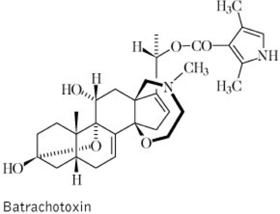 Droge: das Hautsekret. Inh.: Steroidalkaloide, wie Batrachotoxin vgl. Formel, Pseudobatrachotoxin, Batrachotoxinin A und Homobatrachotoxin. Wirk.: Blockade des Natrium-Kanals erregbarer Membranen, gefolgt von Dauererregung, Lähmung und Herzstillstand. Die LD50 von Batrachotoxin liegt bei ca. 2 µg pro kg Maus (s.c.), dieser Naturstoff zählt daher zu den toxischsten Substanzen überhaupt. Anw.: von den südamerikanischen Indianern als Pfeilgift verwendet.