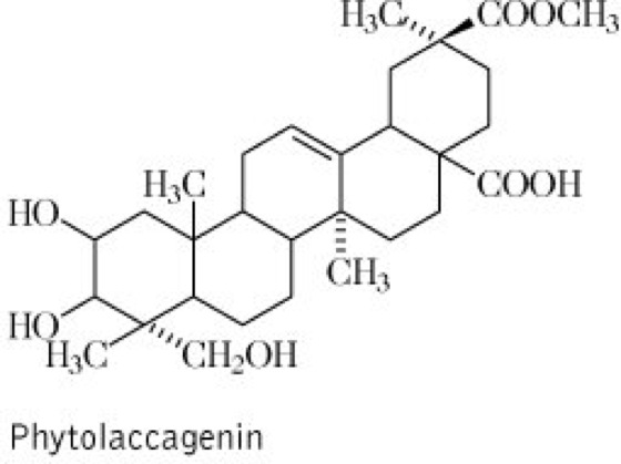 Drogen:1.Fructus Phytolaccae (syn. Baccae Solani racemosi, Fructus Solani racemosi, Phytolacca e baccis); Phytolacca-americana-Früchte (syn. Alkermesbeeren, Kermesbeeren, Scharlachbeeren), die reifen Früchte. Die Droge ist giftig! Inh.: Phytolaccanin, der rote Farbstoff mit dem Aglykon Phytolaccagenin vgl. Formel; Triterpensaponine, Lignane, Lectine (Pokeweed-Mitogene). Anw.: in der amerikanischen Volksheilkunde zur Behandlung von Hautentzündungen, Wunden und bei Rheuma. Früher wurde aus der Droge eine roter Farbstoff gewonnen und zum Färben von Wein eingesetzt. 2.Radix Phytolaccae (syn. Radix Phytolaccae decandrae, Radix Solani racemosi, Phytolacca, Radix Mechoacannae); Phytolacca-americana-Wurzel (syn. Amerikanische Nachtschattenwurzel, Kermeswurzel, Kermesbeerenwurzel), die getrockneten Wurzeln. Inh.: Triterpensaponine, insbesondere die Phytolaccoside A, B, D, E, F, G und Phytolaccosaponin B; Lectine (cysteinreiche Glykoproteine = Pokeweed-Mitogene), α-Spinasterol, Histamin, γ-Aminobuttersäure. Anw.: in der Volksheilkunde bei Rheuma, Katarrhen, Dysmenorrhoe, Dyspepsie, Entzündungen des Mund- und Rachenraumes, Syphilis, Krätze und Geschwüren angewendet. Außerdem dient die Droge als Brechmittel und Laxans, die amerikanischen Indianer verwendeten einen Extrakt auch gegen Tumore. In der experimentellen Medizin werden die Lectine (Pokeweed-Mitogene) zur immunologischen Diagnostik (Stimulation der Antikörperproduktion von B-Zellen) eingesetzt.