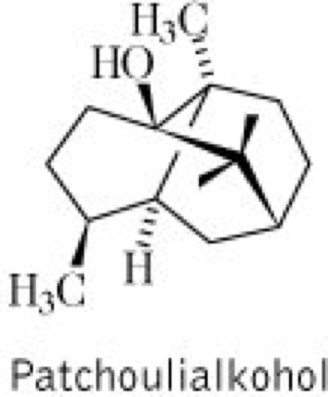 Drogen:1.Folia Patchouli (syn. Herba Patchouli); Patschuliblätter (syn. Patchouliblätter), die Blätter. Inh.: äther. Öl (1,5-4 %). Anw.: in der Volksheilkunde als Antiseptikum sowie zur Gewinnung von Oleum Patchouli. Auch zum Parfümieren von Teppichen und zum Vertreiben von Insekten wird die Droge eingesetzt. 2.Oleum Patchouli (syn. Oleum Foliorum Patchouli); Patschuliöl (syn. Patchouliöl), das äther. Öl aus den Blättern. Zu dessen Gewinnung werden die Blätter nach der Ernte kurz angetrocknet, zu Ballen gepreßt und danach fermentiert (Autolyse) sowie erneut getrocknet. Durch Wasserdampfdestillation wird das äther. Öl abgetrennt. Inh.: Patchoulialkohol = Patchoulicampher (ca. 50 %) vgl. Formel, Sesquiterpene, wie Dhelwangin; Eugenol, Zimtalkohole, Azulene, Patchoulipyridin und Epiguaipyridin. Anw.: in der Volksheilkunde als Antidepressivum und Aphrodisiakum mit beruhigenden und stärkenden Eigenschaften sowie in der Kosmetik und Parfümerie, früher auch als Mottenschutzmittel.