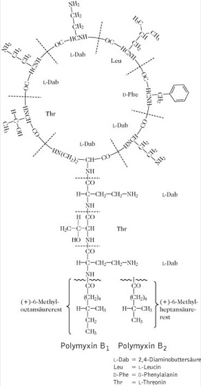 Antibiotika aus der Gruppe der heteromeren Polypeptide (Acylpeptidantibiotika), die von Bacillus polymyxa var. colistinus gebildet werden, u.a. Polymyxin B1 und B2, Polymyxin E1 und E2 (Colistine). Wirk.: Schädigung der Zytoplasmamembran (Einlagerung eines Fettsäurerestes in die Membran) von Bakterien und damit Erhöhung der Permeabilität bzw. Aufheben der osmotischen Barriere, insbesondere bei gramnegativen Stäbchen. Anw.: als Antibiotika der zweiten Reihe zur Behandlung von Haut-, Schleimhaut- und Augeninfektionen sowie Infektionen des Gehörganges. Eine parenterale Applikation wird wegen der schweren Nebenwirkungen (Nierenschäden, neurologische Fehlfunktionen) nicht mehr empfohlen.
