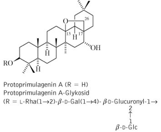 Drogen:1.Primulae flos cum calycibus (syn. Flores Primulae, Flores Primulae cum calycibus); Primula-elatior-Blüten (syn. Aurikeln, Himmelsschlüsselblumen, Primelblüten, Schlüsselblumenblüten), die getrockneten, ganzen Blüten mit Kelch. Inh.: Flavonoide, u.a. Apigenin und Luteolin sowie Kämpferol- und Quercetinglykoside, ferner Saponine, Carotinoide und Spuren äther. Öls. Anw.: Katarrhe der Atemwege. Volkstümlich auch bei Angstzuständen, Schlaflosigkeit und Hysterie. 2.Primulae flos sine calycibus (syn. Flores Primulae, Flores Primulae sine calycibus); Schlüsselblumenblüten ohne Kelch, die nach der Entfernung des Kelches sorgfältig getrockneten Blüten. Inhaltsstoffe und Anwendung s. Primulae flos sine calycibus.3.Primulae radix (syn. Radix Primulae, Rhizoma cum radicibus Primulae, Rhizoma Primulae); Primula-veris-Wurzel (syn. Schlüsselblumenwurzel), der getrocknete Wurzelstock mit Wurzeln. Inh.: Triterpensaponine (4-10 %) mit Protoprimulagenin A vgl. Formel (13β,28-Epoxyoleanan-3β,16α-diol) als dominierendem Sapogenin und D-Glucose, L-Rhamnose und D-Galactose als Monosaccharidkomponenten. Als Nebensaponine liegen Glykoside des Priverogenin-A-monoacetats vor. Außerdem Phenolglykoside, u.a. Primverin und Primulaverin, sowie Spuren von äther. Öl. Anw.: Katarrhe der Atemwege. Volkstümlich auch u.a. bei rheumatischen und Nierenbeschwerden.