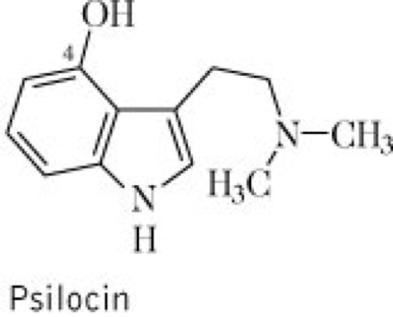 Droge:Psilocybe-cubensis-Fruchtkörper; die abgeschnittenen, oberirdischen Teile (Fruchtkörper). Inh.: Indolalkaloide, wie die Tryptaminderivate Psilocybin (max. 1 %), Baeocystin (0,02 %), wenig Psilocin vgl. Formel. Anw.: als halluzinogene Droge, ursprünglich für rituelle Zeremonien. Heute wird die Droge auch als illegales Rauschmittel genutzt.