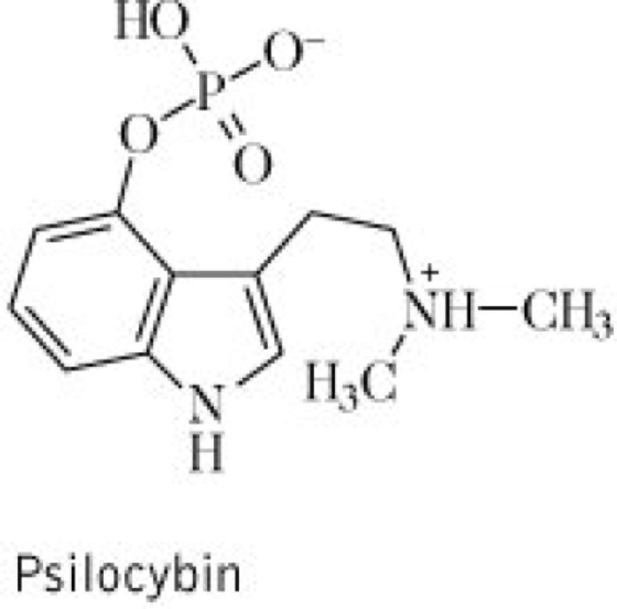 Indolalkaloid mit Tyramingrundkörper, das in Psilocybe-Arten vorkommt. Wirk.: etwa 200 mal geringer wirksam als LSD (Lysergsäurediethylamid) führt P. zu einem psychoseähnlichen Zustand, der durch starke Halluzinationen gekennzeichnet ist. Dabei kommt es zur Wechselwirkung mit serotoninergen Rezeptoren. Halluzinogene biogenen Ursprungs