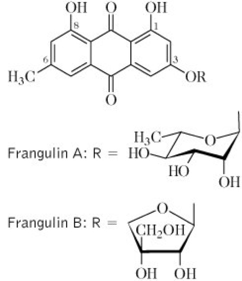 Drogen:1.Rhamni catharticae fructus (syn. Baccae Spinae cervinae, Fructus Rhamni catharticae, Rhamni cathartici fructus); Kreuzdornbeeren (syn. Amselbeeren, Gelbbeeren, Kreuzbeeren, Purgierbeeren, Wegdornbeeren), die ganzen, reifen, getrockneten Früchte; vgl. Abbildung. Inh.: Anthranoide (2-5 %), bes. Franguline vgl. Formel und Glucfranguline mit Emodin und Emodinanthron als Aglyka. Ferner Flavonolglykoside, u.a. Catharticin sowie Kämpferol- und Quercetinglykoside, ferner Gerbstoffe. Anw.: analog Faulbaumrinde bei akuter Verstopfung. Volkstümlich früher zur Blutreinigung. Geg.: bei mitunter auftretenden krampfartigen Magen-Darm-Beschwerden ist Dosisreduktion erforderlich, auch gilt die chronische Anwendung der Droge als Mißbrauch. 2.Rhamni cathartici fructus recentes (syn. Fructus Rhamni catharticae recentes, Rhamni catharticae fructus recentes); Frische Kreuzdornbeeren, die frischen, reifen Früchte. Anw.: s. Rhamni cathartici fructus.