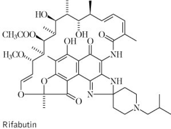 Rifabutin (syn. Ansamicin), Ansamakrolid-Antibiotikum, das von Micromonospora lacustris produziert wird. Wirk.: Transkriptionshemmung durch Bindung an die DNA-abhängige RNA-Polymerase. Anw.: zur Therapie der Tuberkulose und zur Prophylaxe von Mykobakteriosen bei AIDS.