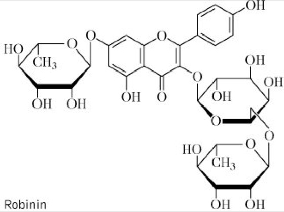 Drogen:1.Cortex Robiniae pseudacaciae; Robinienrinde (syn. Falsche Akazienrinde, Schotendornrinde). Inh.: toxische Proteine, wie Robin (ca. 1,6 %) und Phasin; Syringin, Gerbstoffe (2-7 %); Harz. 2.Folia Robiniae pseudacaciae; Robinienblätter (syn. Falsche Akazienblätter). Inh.: Indican, Asparagin, wenig äther. Öl, Flavonoide. Anw.: als Aromatikum. 3.Flores Robiniae pseudacaciae; Robinienblüten (syn. Falsche Akazienblüten). Inh.: Flavonoide, wie Robinin vgl. Formel, Acaciin; äther. Öl mit Anthranilsäureestern, Farnesol, Nerol, Linalool und anderen stark duftenden Stoffen. Anw.: als Aromatikum und Gewürz. Die Droge dient auch zur Bereitung von parfümierten Wässern sowie zur Ungeziefervertreibung.