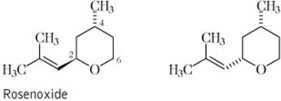 Drogen:1.Rosae aetheroleum (syn. Oleum Rosae, Oleum Rosarum); Rosenöl (syn. Ätherisches Rosenöl, Rosen-Attar). Inh.: Das äther. Öl der frischen Kronblätter enthält bis zu 400 verschiedene Komponenten, duftbestimmend sind v.a. 1-Citronellol, Rosenoxide vgl. Formel und Geraniol sowie Spuren von Neroloxid, Rosenfuran und Rosenketone. Anw.: Rosenöl wird in Form von Aqua rosae (Rosenwasser) und Mel rosatum (Rosenhonig) als Geruchs- und Geschmackskorrigenz für arzneiliche Zubereitungen benutzt. In der Volkheilkunde dient die Droge zur Krampflösung bei Gallenblasen-, Magenbeschwerden und Bronchialasthma. Auch die Aromatherapie zur körperlichen und geistigen Entspannung nutzt den Duft der Droge. Große Mengen des Rosenöls werden seit altersher in der Parfüm- und Kosmetikindustrie verwendet. 2.Rosae flos (syn. Flores Rosae, Rosae petalum); Rote Essigrosenblüten oder weiße Zentifolienrosenblüten (syn. Rosenblüten). Inh.: bis 0,02 % äther. Öl (siehe Rosae aetheroleum), Flavonolglykoside, Anthocyane, Gerbstoffe, Chinasäure u.a. Anw.: Die Droge soll adstringierende Wirksamkeit besitzen, in der Volksheilkunde wird sie bei leichten Entzündungen im Mund- und Rachenraum sowie bei Aphthen und Lidentzündungen eingesetzt; früher auch innerlich bei Blutungen, Weißfluß, Durchfall und Lungenkrankheiten. Rosenblätter finden weiterhin Anwendung als Schmuckdroge in Teemischungen, in Pudern und Bädern zur Parfümierung sowie als Gewürz in Form von Rosenblättermarmelade oder Rosenessig.