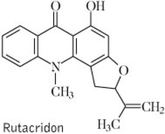 Drogen:1.Rutae aetheroleum (syn. Oleum Rutae); Rautenöl, das durch Wasserdampfdestillation aus den krautigen, oberirdischen Teilen gewonnene Öl. Inh.: s. Rutae herba. Anw.: früher volkstümlich bei Krämpfen und Menstruationsbeschwerden sowie mißbräuchlich als Abortivum. 2.Rutae herba (Folia Rutae, Herba Rutae, Herba Rutae graveolentis, Herba Rutae vulgaris); Rautenkraut (syn. Edelrautenblätter, Gartenrautenblätter, Rautenblätter, Weinrautenkraut), die während der Blüte gesammelten krautigen Teile. Inh.: Alkaloide verschiedener Strukturtypen, u.a. Chinolin-, Furochinolin und Alkaloide vom Acridontyp (z.B. Rutacridon) vgl. Formel, äther. Öl, u.a. mit mittelkettigen Ketonen, z.B. 2-Nonanon (Hauptkomponente) und 2-Undecanon, Flavonoide, u.a. Rutosid (Rutin), Cumarine sowie Furano- und Pyranocumarine. Anw.: volkstümlich bei Entzündungen, insbes. der Haut sowie des Mund- und Rachenraumes, ferner bei Dyspepsien, Leber- und Galleleiden, bei Menstruationsbeschwerden und mißbräuchlich als Abortivum. Geg.: infolge verschiedener unerwünschter Wirkungen, z.B. Reizwirkung auf Haut- und Schleimhäute, die teilweise auch im Zusammenhang mit der Phototoxizität der Furochinoline und Furanocumarine stehen, ist die therapeutische Anwendung der Droge nicht zu empfehlen.