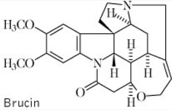 Droge:Strychni semen (syn. Nux Metella, Nux vomica, Semen Nucis vomica, Semen Strychni); Brechnußsamen (syn. Krähenauge, Strychnossamen), die reifen, getrockneten Samen; vgl. Abbildung. Inh.: Alkaloide (2-3 %) mit Strychnin (1,1-1,5 %) und Brucin (ca. 1 %) vgl. Formel als Hauptalkaloide. Anw.: früher in Zubereitungen, z.B. der Tinktur, als Tonikum, appetitanregendes Mittel sowie bei Herz-Kreislauf-Beschwerden. Ferner als Ausgangsmaterial zur Gewinnung von Strychnin.