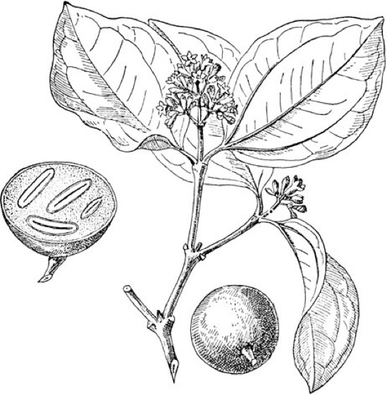 •Strychnos nux-vomica L. (syn. Strychnos colubrina, S. lucida, S. spireana, S. vomica). Brechnußbaum (syn. Krähenaugenbaum, Strychninbaum).