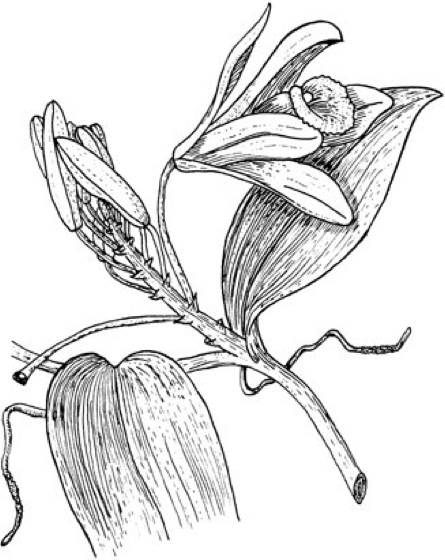 Vanilla planifolia, blühender Sproß mit rankenden Wurzeln.