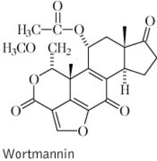 Wortmannin Steroid-Derivat aus Kulturen von Penicillium wortmannii und Myrothecium roridum. Wirk.: antifungal, antiinflammatorisch, hämorrhagisch, immunsuppressiv. Anw.: in der experimentellen Pharmakologie sowie ansatzweise zur Rheumatherapie unter Beachtung der starken Nebenwirkungen (Blutungen).
