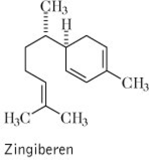 Drogen:1.Zingiberis rhizoma (syn. Radix Zingiberis, Rhizoma Zingiberis); Ingwerwurzelstock (syn. Ginfer, Ginferwurzel, Ingber, Ingberimber, Ingberwurzel, Ingwer, Ingwerklauen, Ingwerwurzel, Ingwerzehen), das vollständige, teilweise oder nicht geschälte Rhizom; vgl. Abbildung. Inh.: äther. Öl komplexer Zusammensetzung (2,5-3 %, Sesquiterpene, wie Zingiberen vgl. Formel, ar-Curcumen, β-Bisabolol, Farnesen; Monoterpene, wie Campher, β-Phellandren, Geranial, Neral, Linalool), abhängig von der Herkunft der Droge, sowie nichtflüchtige Scharfstoffe (Arylalkane), wie Gingerole, Shogaole und Gingerenone. Anw.: Ingwer findet hauptsächlich als Gewürz Anwendung, aber auch als Stomachikum, Tonikum, zur Verdauungsförderung bei Dyspepsie sowie zur Appetitanregung. Die Droge wird in gepulverter Form ebenfalls als wirksames Antiemetikum eingesetzt, insbes. die Shogaole und Gingerole sind dafür verantwortlich. Diese Wirkstoffe sind auch an den molluskiziden und antischistisomalen Effekten des Ingwers beteiligt. Auf molekularer Ebene konnte die Hemmung von Enzymen des Prostanoid-Stoffwechsels durch Gingerole und Diarylheptanoide der Droge nachgewiesen werden, was mit der günstigen (entzündungshemmenden) Wirkung bei Magengeschwüren korreliert. Auch bei der Behandlung von Migräne, als Expektorans und Karminativum wird Ingwer in der traditionellen Medizin Asiens eingesetzt. Ingwer ist Bestandteil der Tinctura aromatica, Tinctura Zingiberis und wird in kandierter Form als Konfekt (Confectio Zingiberis) genossen sowie zur Bereitung des Ginger Ale verwendet. 2.Oleum Zingiberis; Ingweröl, das durch Wasserdampf-Destillation aus dem getrockneten Wurzelstock gewonnene äther. Öl. Grüngelbliche Flüssigkeit mit charakteristischem Geruch nach Zingiberen. Inh.: s. Zingiberis rhizoma. Anw.: Ingweröl wird hauptsächlich in der Likörherstellung, Süßwaren- und Parfümindustrie verwendet.