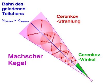 Ein vergleichbares Phänomen tritt ein, wenn ein relativistisches, geladenes Teilchen ein transparentes Medium wie Wasser oder Eis durchläuft und eine höhere Geschwindigkeit hat, als die des Lichtes in diesem Medium. Dann emittiert es (analog zum obigen Beispiel der Kugelschallwellen) die Cerenkov-Strahlung. Auch hier bildet sich als Einhüllende der Machsche Kegel aus. Die Abstrahlung unter einem konstantem Winkel, dem Cerenkov-Winkel thetaC, hängt nur von der Teilchengeschwindigkeit v und der Mediumlichtgeschwindigkeit cm ab: cos(thetaC) = cm/v = c/(nv) mit der Vakuumlichtgeschwindigkeit c und dem Brechungsindex n. In Wasser liegt der Cerenkov-Winkel für relativistische Myonen bei etwa 40 Grad. Ebenso lässt sich abschätzen wie viele Cerenkov-Photonen im Mittel pro Wegstrecke emittiert werden. Typische Werte sind 200 Photonen/cm.