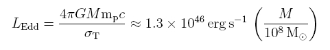 In den Gleichungen wurden typische Zahlenwerte für AGN zugrunde gelegt. Theoretische Astrophysiker benutzen meist das cgs-System und geben deshalb Energien nicht in Joule, sondern in erg an. Die Gleichungen besagen nun, dass ein Quasar, bei dem Astronomen eine Leuchtkraft von 1047 erg/s beobachten gemäß Eddingtons Argument ein supermassereiches Schwarzes Loch von 100 Mio. bis einer Mrd. Sonnenmassen beherbergen muss!