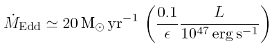 Die Leuchtkraft mit der Dimension Energie/Zeit kann über eine Größe namens Effizienz (in folgender Gleichung ε) an eine Akkretionsrate mit der Dimension, Masse pro Zeit, koppeln. Die Effizienz macht eine Aussage darüber, wie effizient die akkretierte Masse in Strahlung umgewandelt werden kann. Ein typischer, empirischer Wert für die Effizienz ist 10% (bei schnell rotierenden Löchern kann er auch bei 42% liegen!). Korrigiert man um einen Faktor c2 wird aus der Masse eine Energie und aus der Leuchtkraft eine Akkretionsrate: Aus der Eddington-Leuchtkraft wird so die Eddington-Akkretionsrate: