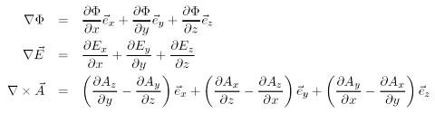 Der mathematische Apparat der klassischen Elektrodynamik umfasst die Vektoranalysis, die Potentialtheorie und die Theorie Greenscher Funktionen. Der Nabla-Operator ist der zentrale Differentialoperator, der die Maxwell-Gleichungen kompakt mithilfe von Gradient (grad), Divergenz (div) und Rotation (rot) schreiben lässt. In der folgenden Abbildung sind von oben nach unten Gradient eines Skalarfeldes, Divergenz eines Dreiervektors, Rotation eines Dreiervektors in kartesischen Koordinaten dargestellt (für andere Koordinatensysteme wie Kugelkoordinaten nehmen die Gleichungen eine andere Form an).
